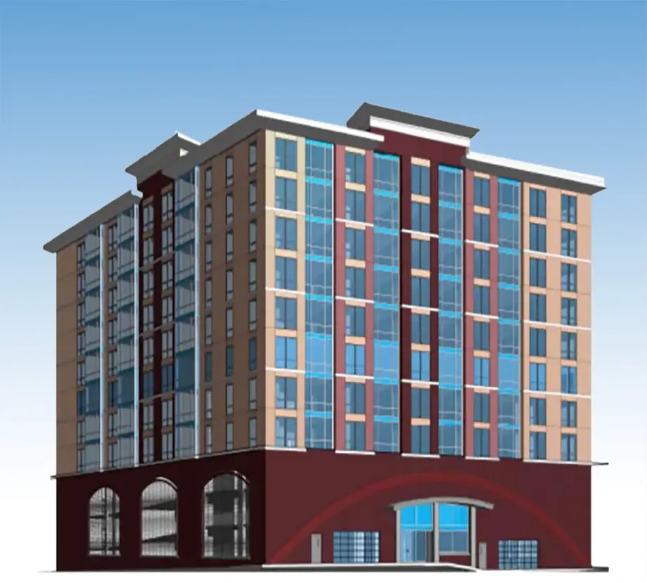 A 8-story, 108-Apartment, hi-rise building plus 3 level of parking garage.